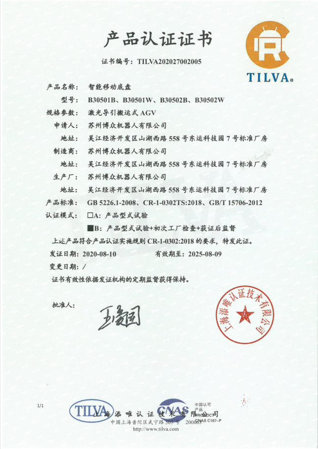 “博时捷”智能移动底盘支持CECR认证,为客户产品后续开拓大型项目市场、出口贸易做出基础保障。