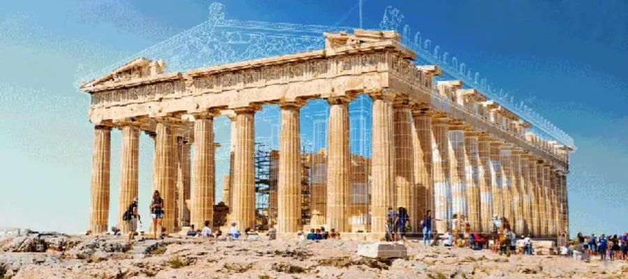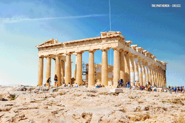 再看帕特农神庙。在希腊首都雅典卫城的古城堡中心,这座建筑正伫立在那里,俯瞰世界。历经2000多年的沧桑变迁,这所神庙已经坍塌。但在这个GIF中,只见庙柱先被修复,随后庙顶生成。最后,精致的雕花完美复刻了那个年代的战争与和平。