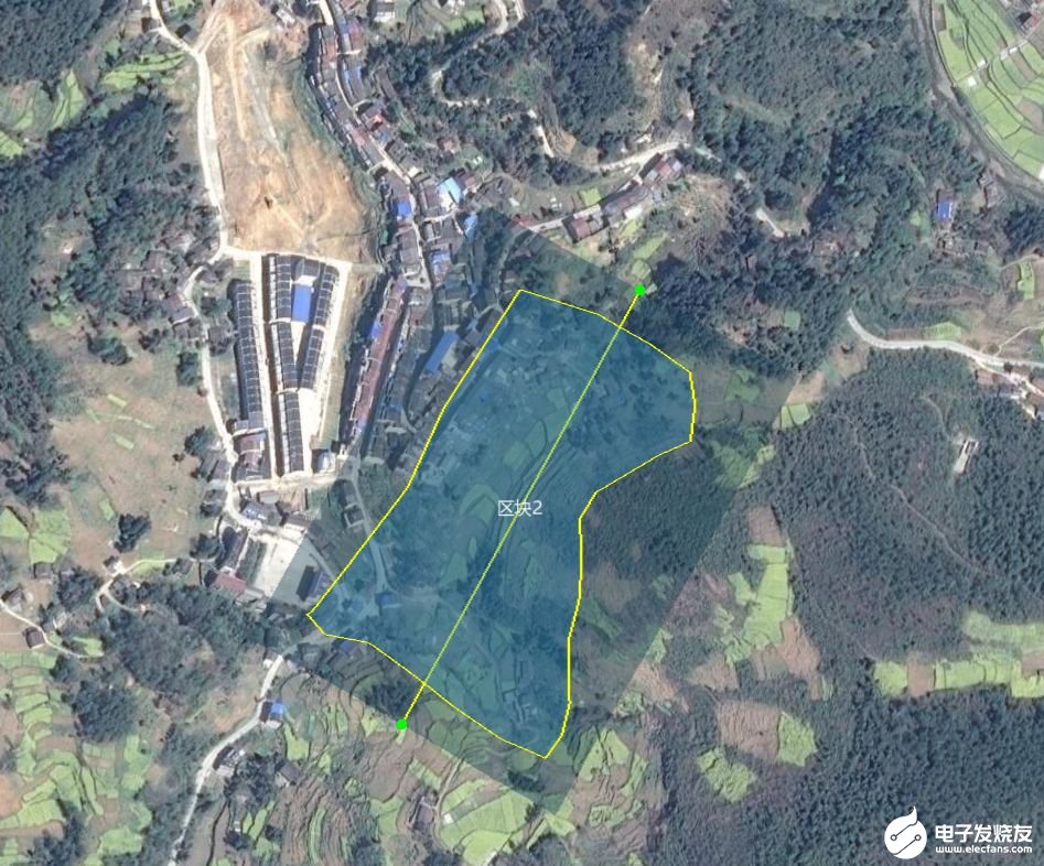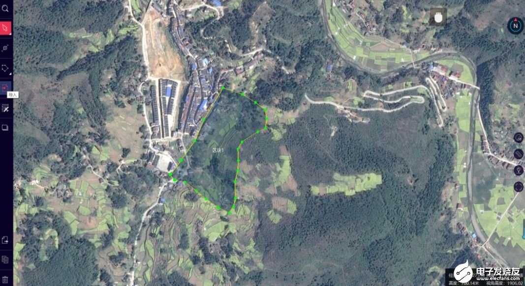 点击智航线之后,新建一个工程,并以此安置点项目的名称对这个工程文件进行命名。工程创建完成以后,根据业主提供的资料,需要将已有的测区范围kml 导入到软件自带的谷歌地图上。单击左边导入选项,选中测区范围的kml文件。导入成功之后,如图2-2所示,图中黄线框中的阴影部分就是本次需要航测的移民安置点面积。