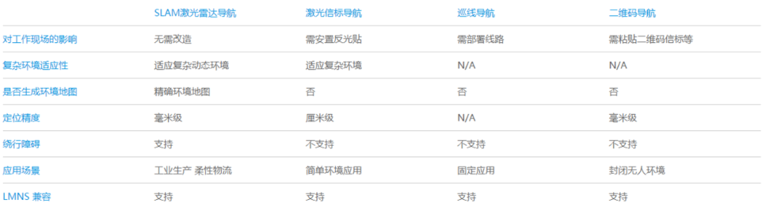 目前应用在工业环境的主流导航机器人有磁带导航机器人、二维码导航机器人和激光导航机器人,而上述的三种机器人分别属于三个跨代技术的产品,一代比一代先进,下图是几种导航方式的对比。