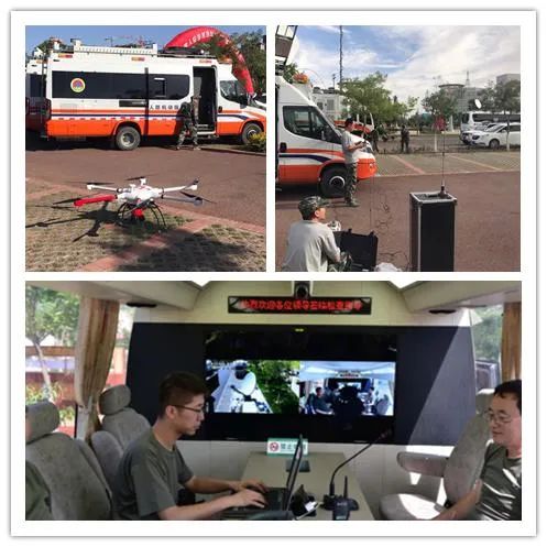 慧明捷在本次训练中使用了专业级六旋翼无人机,高清单兵通信设备,4G设备等专业先进的无线应急通信设备和专业的技术人员,活动开始慧明捷专业级六旋翼无人机抵达上空、将整个训练现场的实时画面,清晰流畅的传至现场指挥车,实现了空地一体联动,为现场指挥人员全面观看整个活动提供了强有力的帮助,目前该训练还在进行中,慧明捷还将为人防信息化建设继续添砖加瓦.