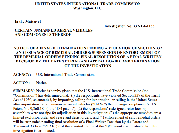 美国国际贸易委员会于2018年10月2日开始调查。2020年3月2日,ITC首席行政法法官(CALJ)Bullock发布了对大疆有利的初步裁决。CALJ判定大疆没有侵犯174专利,还根据多种理由判定013专利权主张无效。不过,CALJ判定许多大部分大疆产品侵犯了184专利。