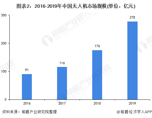 从国内市场来看,随着无人机民用化进程的加快,我国无人机行业快速发展。2016年,我国无人机行业市场规模约为91亿元,到2019年,该数字已突破200亿元,达到278亿元。