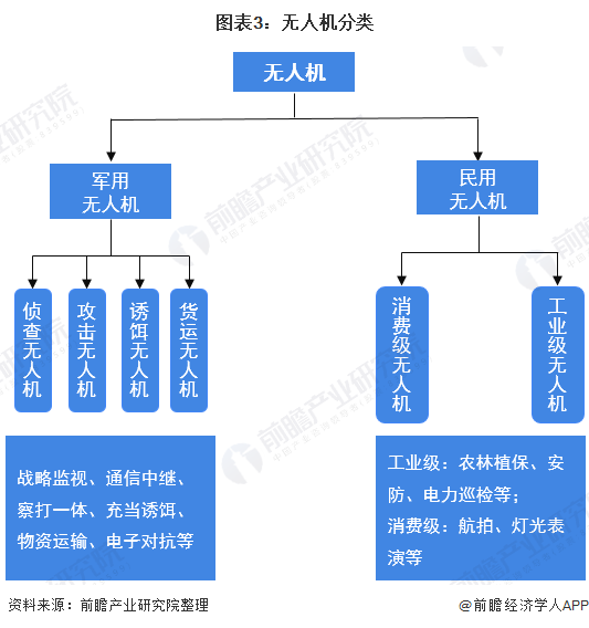 无人机按用途发分主要分为军用无人机和民用无人机,其中民用无人机又分为消费级无人机和工业级无人机。