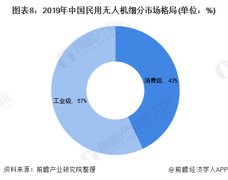 经过几年的发展,我国无人机的应用范围已逐步扩大到传统通用航空的多个领域,工业级无人机应用范围广泛,发展潜力巨大。目前我国工业级无人机在民用无人机中的占比在57%左右,成为民用无人机的主体,其增长空间远超消费级无人机。