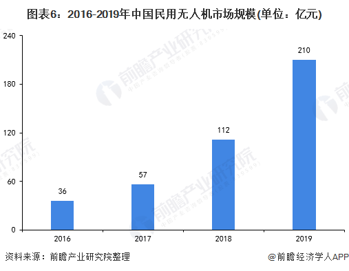 近年来,随着无人机的不断普及,民用无人机市场快速放量,2019年市场规模约为210亿元。
