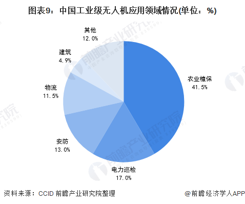 从各细分应用领域来看,消费级无人机主要应用于航拍、灯光秀表演等;工业级无人机应用领域则比较广泛,包括农业植保、电力巡检、物流、安防等。