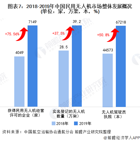 全行业实名登记无人机共39.2万架,比2018年新增10.7万架,同比增长37.5%;无人机驾驶员执照总数为67218个,比2018年新增22645个,同比增长50.8%。