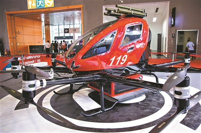展览现场,最吸引眼球的就是亿航新推出的消防无人机。“这是我们7月31日发布的新产品,主要用于城市超高层建筑消防灭火。”亿航首席战略官徐华翔介绍。这款消防无人机的飞行高度达600米(相当于广州塔桅杆顶端高度),可覆盖广州所有超高层建筑的高度。“城市里分布着大量200米以上的建筑,消防无人机将为它们提供最佳解决方案。”