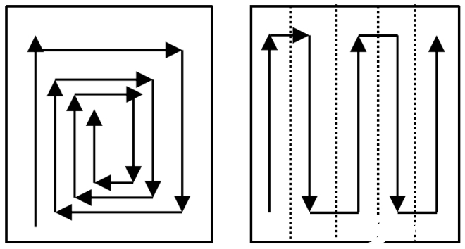 2)子区域内采用 “螺旋收缩式”进行全覆盖。相比 “往返前进式”的覆盖方法,前者比后者留下较小的未覆盖面积, 前者在终点的位置比较固定,一般位于区域重心附近,如图3。