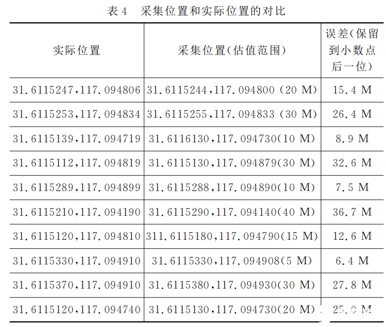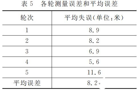 通过5论测试之后, 得到通过本论文方法的测量误差为8.24 M。此误差对于放养牛羊等牲畜的定位, 具有实际使用价值。