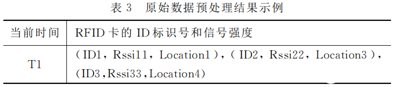 将以按时间划分的元数据,转换为以 RFID 进行划分的数据。数据采集模块采集到的元数据格式 Data1= {t1,long1, lati1,{{rfid1,rssi1}, {rfid2,rssi2}。}}。由于每项数据是以时间为主键进行的划分,不便于后期的数据分析处理,需要把数据转化为以 RFID 号为主键的划分。转化方法为遍历每个rssi和经 纬度数据。转换后格式为 Data= {rfid1, {rssi1,{long1,lati1},{rssi2,{long2,lati2},… …}}}。