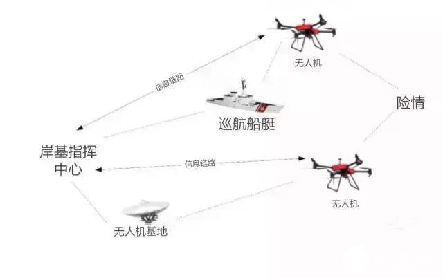 如图所示,当发生危险事故、不明来历船只等情况下,无人机配合巡航船艇进行联合取证。无人机将险情信息和现场取证信息实时传输给指挥中心,由指挥中心根据险情大小做出判断,决定下一步的执行计划。