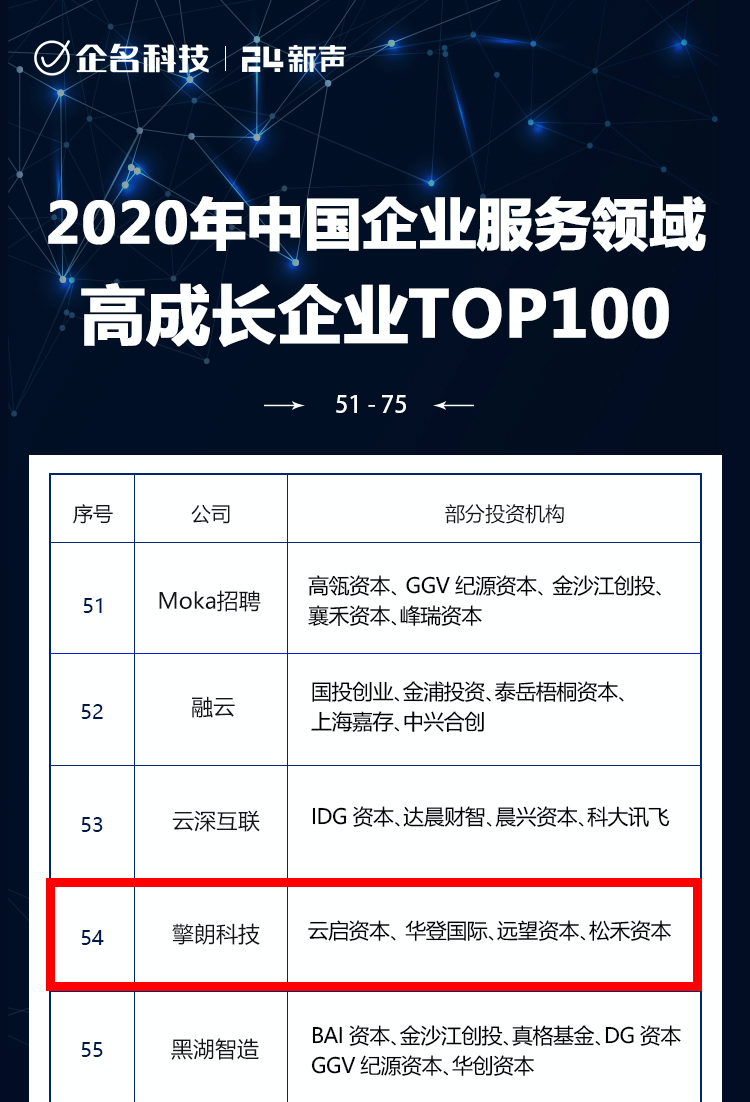 该榜单由知名智库型商业服务平台24新声发布,旨在发现中国企业服务领域高成长企业。这份榜单基于国内89681个企业服务领域创业项目,面向A轮-Pre IPO阶段超过2000家企业服务创业企业,从企业团队背景、业务数据、财务数据和市场影响力四个角度出发,运用大数据分析与调研问卷、集合走访、电话访谈结合的方式综合评判,最后以详实的数据、严谨的标准评选出近三年内企业服务领域具备高成长性的TOP100企业。