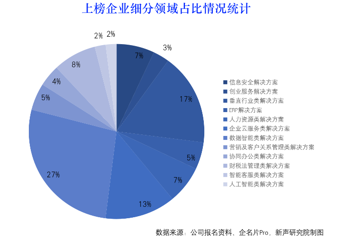 据24新声分析,入榜的100家公司几乎涵盖了企业级服务的大部分相关领域。其中,智能数据解决方案类的企业最受认可,占比高达27%,其次为垂直行业解决方案占比达17%。