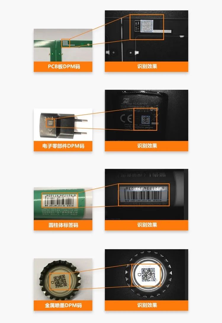 ID2000系列可广泛应用于3C电子、半导体、食药品包装、汽车零部件等行业的读码场景,以下为常见应用效果: