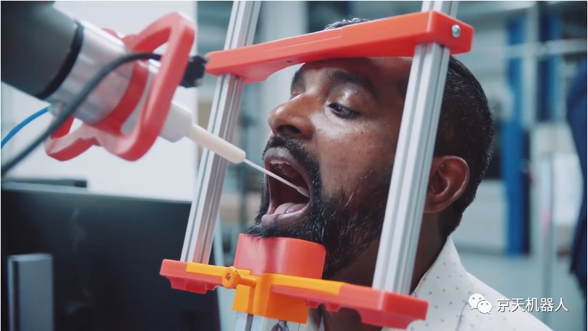该机器人是与南丹麦大学的机器人研究人员合作开发的,使用 UR3协同机器人手臂,该手臂植入定制的3D打印末端执行器。该过程本身就是简单的过程,从患者扫描其身份证开始。机器人立即准备好一个样品套件,其中包括一个带有印刷ID标签的容器,然后拿起药签。然后,机器人使用其内置的视觉系统识别出正确的点,以擦拭患者的喉咙。拭子过程完成后,自动程序将样品放入广口瓶中并拧紧紧凑。然后将罐子放置实验室进行分析。整个过程总共大约需要7分钟,而除去子仅需25秒。该系统于五月底在丹麦正式启动。