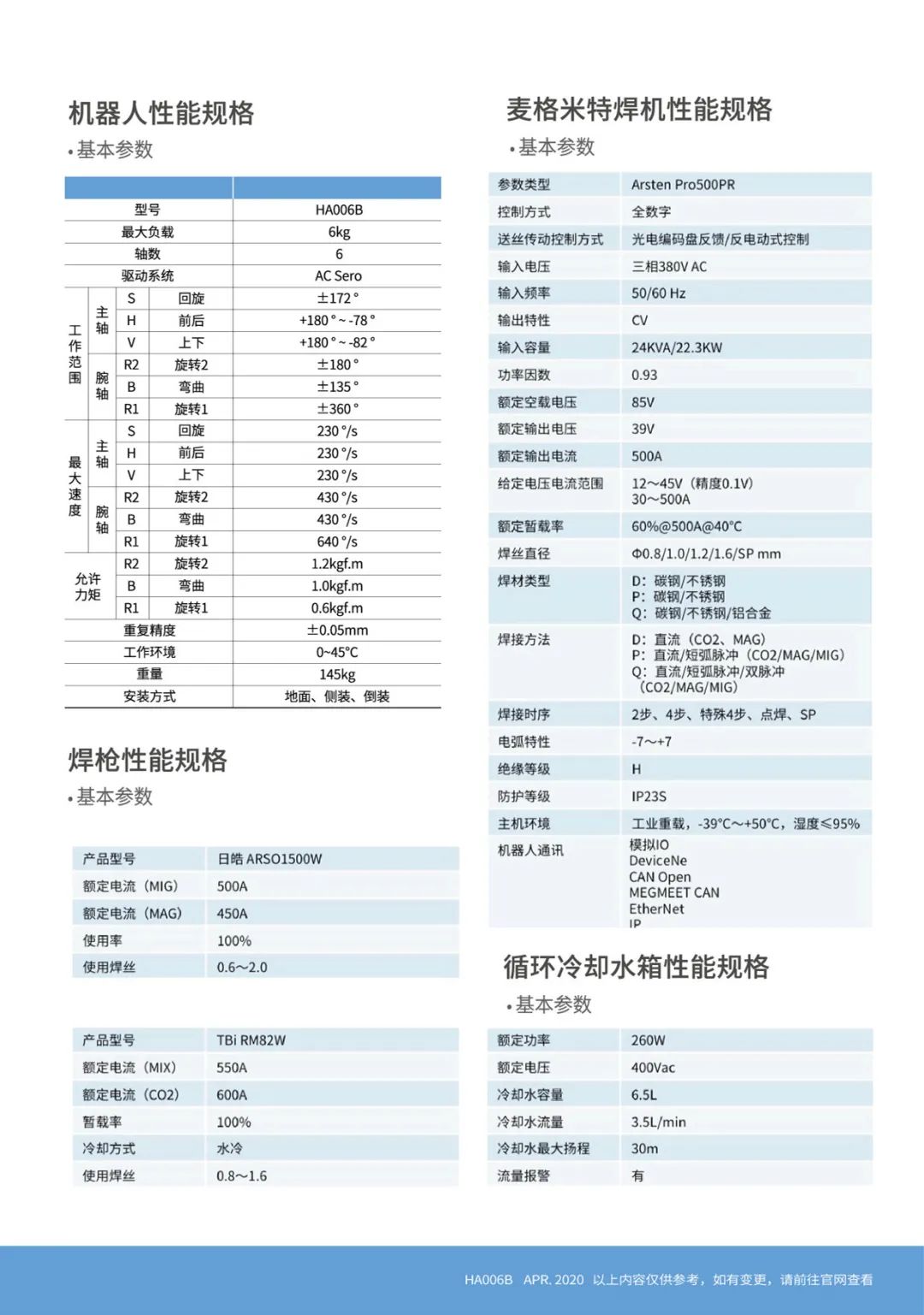 HA006B智能弧焊套机配备的焊机可根据所选择的不同型号焊接电源分别采用直流(CO2/MAG)、短弧脉冲(CO2/MAG/MIG)、双脉冲(CO2/MAG/MIG)的焊接方法,进行碳钢、不锈钢和铝合金的焊接。全新脉冲工艺,带来全新的焊接体验,让脉冲焊接变得更加容易。