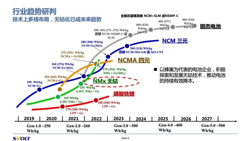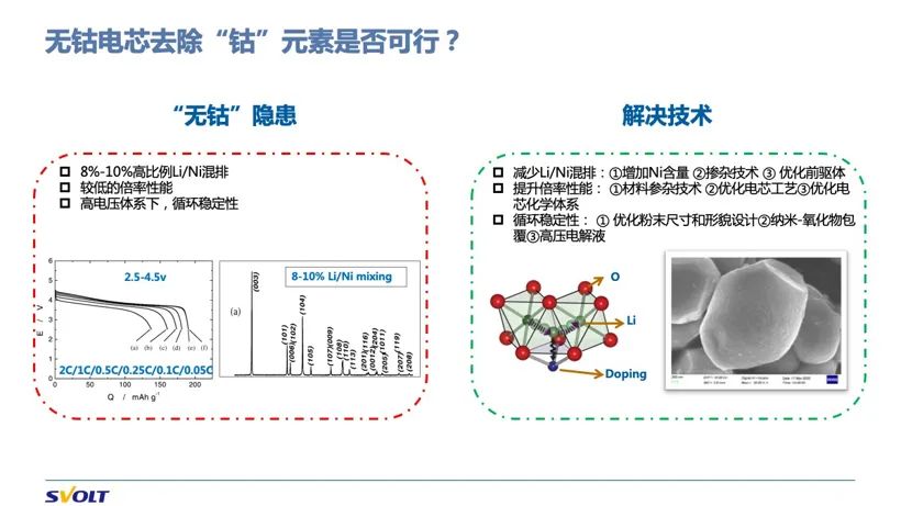 大家都知道要去掉钴,或者把钴减少,但是技术的挑战确实是非常多的。其实没有钴的,高能量密度的电池的理论,在20年前日本的学者就提出来过,但是这么多年来,要不就是大家投入精力少,要么就是技术没有做得很好,没有解决锂镍混排的问题。如果8%-10%锂镍混排不能解决的话,产品稳定性、倍率性都是非常差的。解决方案有很多种,经过很长时间的摸索,包括我们也做了很多年的摸索,从增加镍的含量,包括一些技术等等,来提高它的稳定性。总体来讲就是提高阳离子模式掺杂、单晶,太专业的就不在这里讲了。从测试数据来看,新鲜的电池,就是刚刚生产的电池的镍混排可以控制在3.5%左右,是非常低的。那么循环到后期的电池,锂镍混排控制在小于5%以内,是很好的解决了前面提到的锂镍混排的问题,同时金属溶出这个问题,也是无钴电池必须要解决的。从右边的这个图上来看,跟811对比,我们的镍、锰的溶出率都小于811的材料,所以循环寿命和稳定性都是非常好的。而且我们做了2吨电池的测试,已经量化了。从产品上来看,无钴材料、无钴电池一定要是高能量密度的才可以,如果能量密度过低就是磷酸铁锂,没有价值了。它的能量密度一定要接近811的水平,同时是安全的,比7系的三元更安全,循环寿命好,成本还要低。还是回到刚开始说的,客户什么都想要,我们就做一个什么都能满足他的要求的产品。从实际数据来看,这些目标都已经满足了。这是我们的动力性的测试,唯一一个还有问题,就是第一张图,20%的SOC下,就是DSOC下的功率性能是偏弱的,因为没有钴以后,它的内阻在低温下会偏高。我们也在做解决方案,在测试。其他的功率性能都是挺好的,包括零下30摄氏度的低温性能,还可以支持70%的续航,包括零下20摄氏度的低温充电,界面保持得非常好。还有高温循环寿命,可以超过1200次,常温循环寿命1C1C,我们100%可以超过2500次,811只能做到1500次。针刺我们做的不是刺穿的,是按照欧洲客户要求做的浅刺,欧洲客户要求,刺穿三层电极,只要不起火,不爆炸就算可以,我们刺穿了六层,右边的图片来看都是非常好的。还有150度的热箱,高能性能也是高镍材料最害怕的,我们也顺利的通过了150度热箱的测试,还有140%的SOP的过充,还有外部短路,包括一些其他的测试数据。以上讲的是无钴材料的进展,大家都说无钴材料这么难,真的可以量产吗?现在可以负责任地告诉大家,肯定可以,明年6月份我们就会把无钴的电芯推向市场,装车,装到车上销售。那么无钴还有一个问题,就是它的内阻是偏高的,如果把叠片技术用上,可以再降低它5%的内阻,所以叠片加无钴,这两种技术的结合,既可以发挥无钴的优势,又能解决无钴的痛点。那么我们在把它做成长电芯,做成薄电芯,L6的长电芯,大概将近600毫米长,做成右边的无模组的LCTP的Pack,我们叫矩阵式Pack,一个电池包里放两台电芯,没有模组。它的能量密度,比传统的设计提高了9%,空间利用率提高了17%,电量提升了24%。长城一款采用这种布置形式,无钴、无模组的电池可以做到880公里续航,同时也可以做成有模组的,就是装到MED590的模组也可以,兼容性非常好。以上就是我关于对未来电池技术路线的一些分享,不管怎么样,安全、寿命、能量密度各方面的追求,都是没有止境的。现在我们电池企业,整车企业,对于电池机理的了解还是非常肤浅的,电芯到底为什么突然会自燃?为什么会突然热失控?机理是什么?我们现在都没有办法完全弄清楚,当然我们有比较初步的认识,但是还没有做到研究透,如果真的研究透了,缺陷就可以避免掉。所以我们现在也在做一些研究工作,就是在极低的温度下,零下160摄氏度,用液氮冷冻热失控的步骤,在电芯刚刚产生内短路和产生的初期和后期,把它冻住,然后瞬间把它静止,看它的界面,看它的机理等等,这只是其中的一个研究。目前我们对电芯这个行业的研究,还需要不断地努力和提升。未来的方向,我们希望通过蜂巢能源,通过孚能、力神,我们共同努力,把满足客户的动力电池的技术,不断推向前进,不断满足客户的需求,我的分享就到这里。谢谢大家!