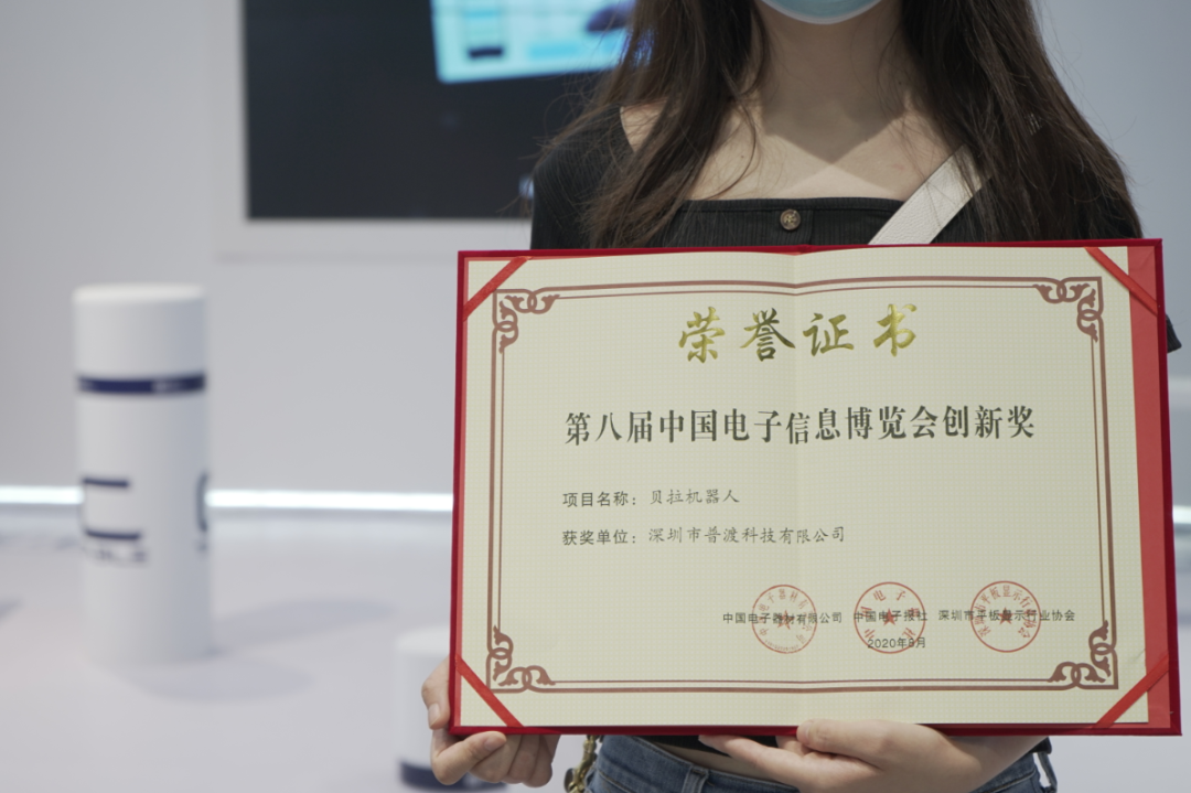 此次,经过技术领先性、市场竞争性、设计新颖性、功能适用性与环保先进性五大维度的严苛评选,和来自相关行业协会、顾问咨询机构、权威媒体等20多位专家的综合评判,普渡科技的贝拉机器人在众多申报产品中脱颖而出,荣获“第八届中国电子信息博览会创新奖”殊荣。