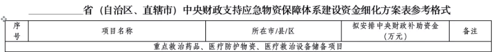 从财政部公布的应急物资保障体系建设资金细化方案表参考格式中,可以看到,本次储备涉及救治药品、医疗防护物资、医疗救治设备。