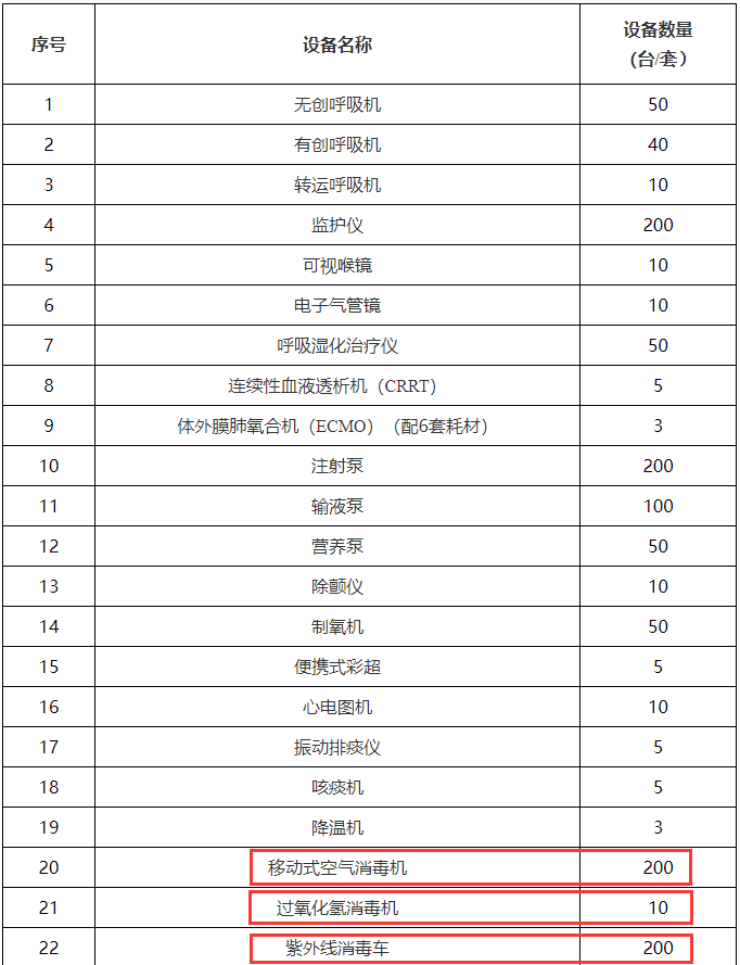 改善呼吸、感染等专科设施条件;储备一定数量的重症患者救治、普通患者监护、方舱医院设备等方面物资。