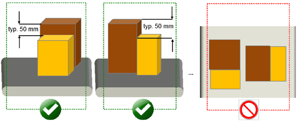 被测物体高度差≤50mm或在输送方向上前后间隔≤50mm时,可检测出偏移量≤50mm的并排立方和不规则物体的数量。此时物体不可紧挨。