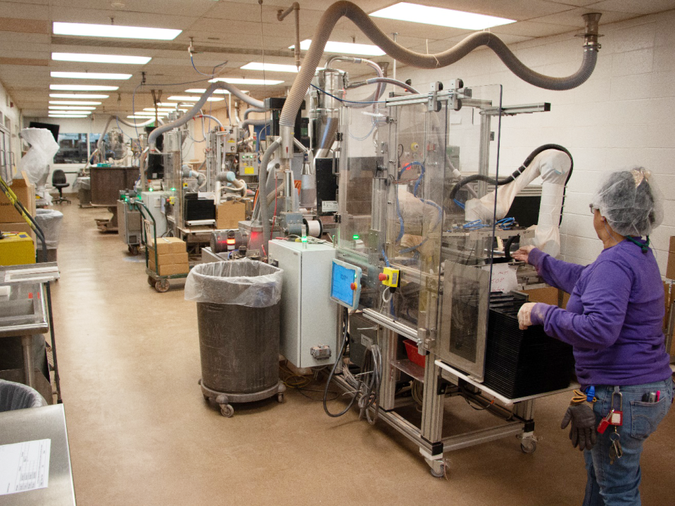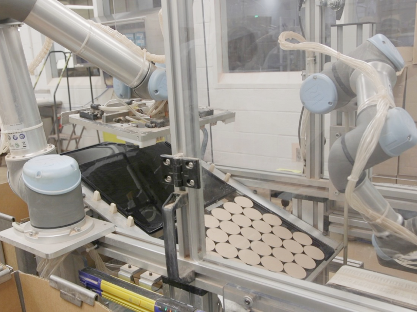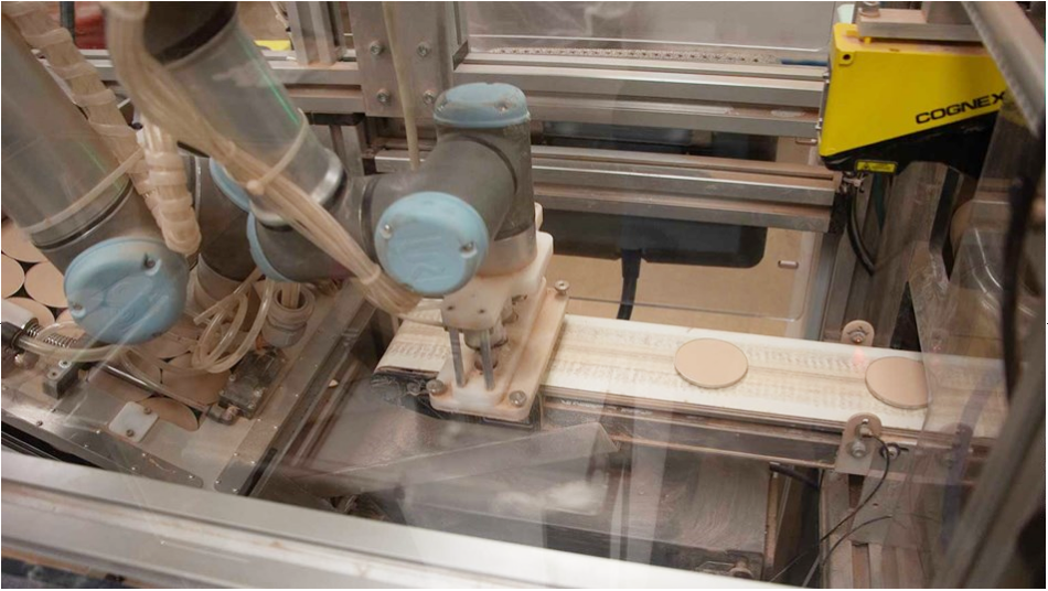 在位于马里兰州的科蒂工厂里,目前四辆移动推车上安置了八台优傲机器人,用以改良和自动化粉饼生产和包装流程。该移动式解决方案能够为其每年节省50万美元,同时改善了质量检验和员工工作环境。