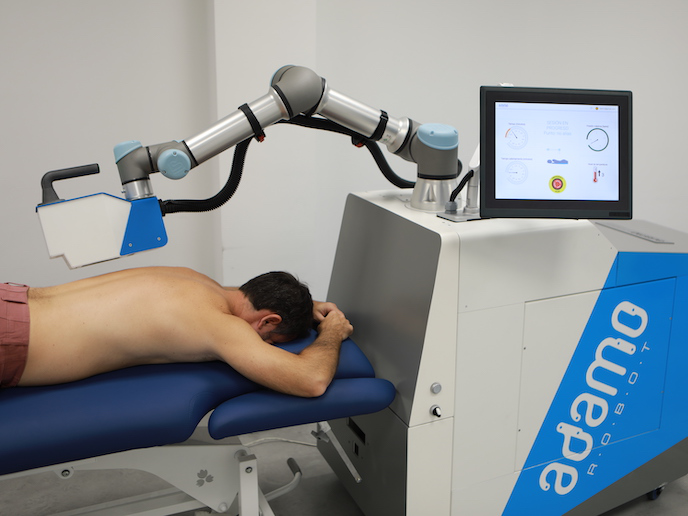 Adamo Robot已寻求解决这些挑战的方法并使所有人都能接受理疗。Jiménez解释说:“我们的目标不是取代治疗师,而是提高他们的生产力。” 为了实现这一目标,已经开发了一种全自动无人理疗机器人。使用人工智能,机器人可以识别有效的治疗方法并跟踪患者的病情。机器人首先通过3D热视觉探索人体,然后,将AI应用于检测背部伤害的类型并定义必要的治疗方法。如果需要治疗,该机器人具有六轴机械臂,能够进行关节运动。但是,这不是通过接触患者,而是通过释放压缩空气来进行治疗的。Jiménez补充说:“虽然有些人可能会因手部治疗的安慰剂作用而感到放心,但非接触式治疗更卫生。”