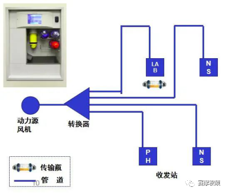 这是一种利用空气压缩机抽取或压缩管道中的空气,造成管道内压差,来输送携带有传输物品的传输瓶,以达到物品运送目的的一套物品传输系统,实现站点间的智能双向点对点传输。