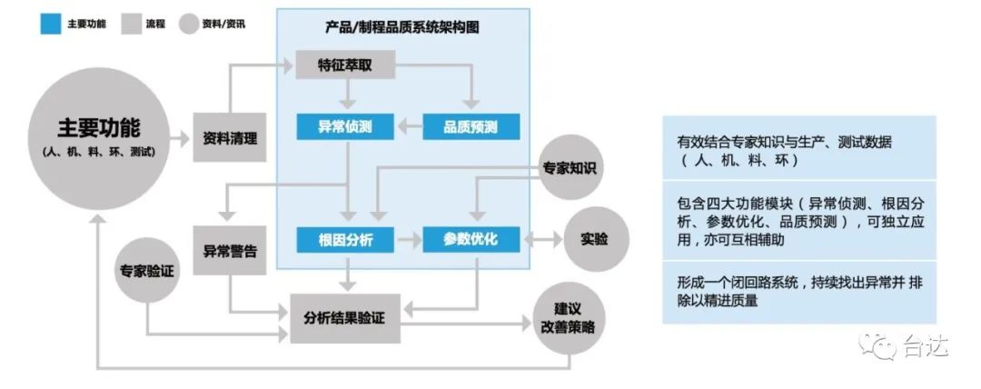 台达根因分析系统的实施架构台达推出的根因分析系统包括数据采集、数据整备、分析建模与系统整合等功能,其核心过程为:将设备状态数据、工艺数据、质量数据、设备参数等信息采集,并进行数据清理/整合等处理,然后对数据进行建模与分析,自动推荐其质量异常产生原因,并将新产生异常原因及其相关知识存储到数据库。同时,该系统可以与其他管理系统集成,从而优化设计、工艺、参数设置等。
