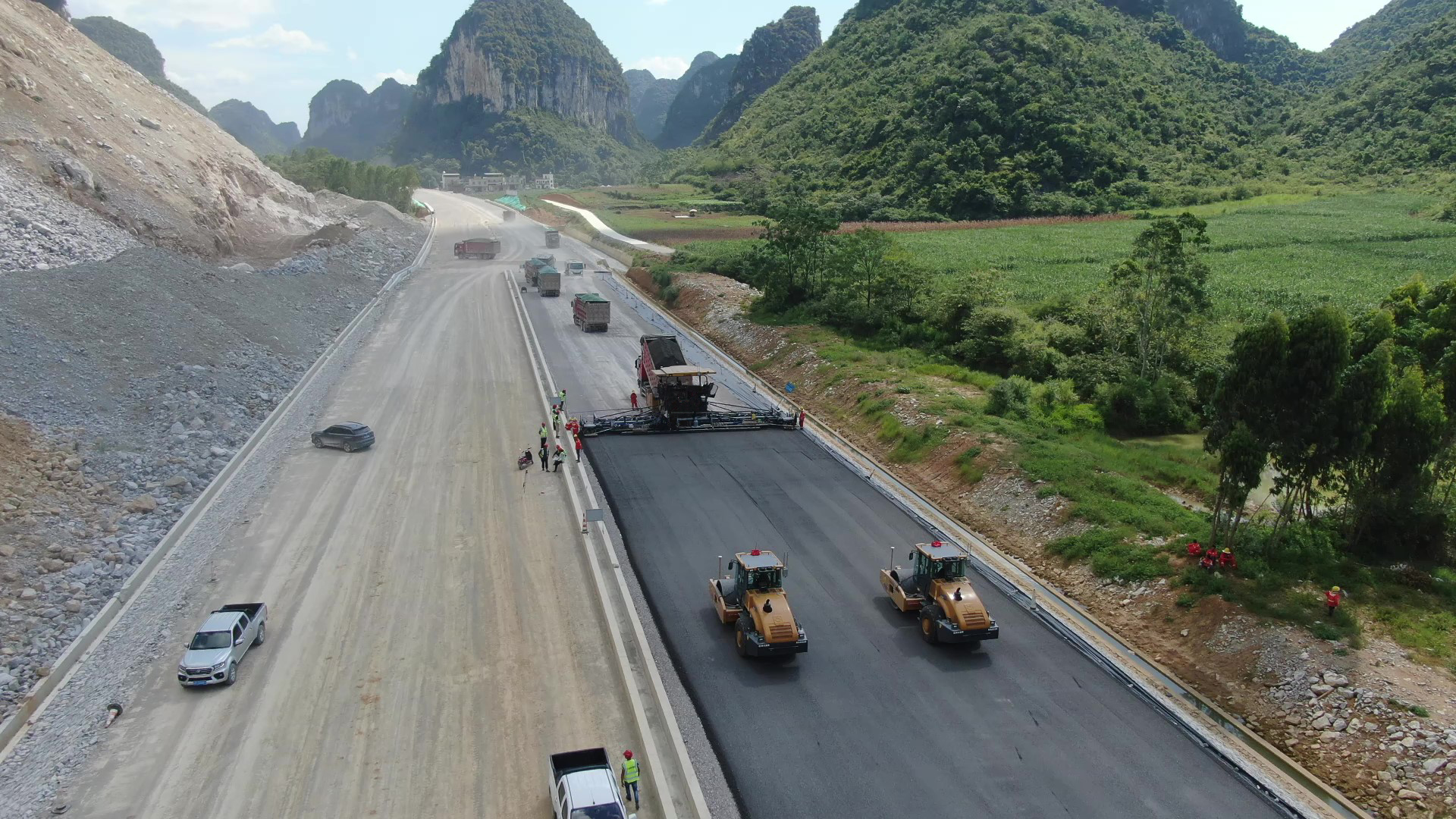 为了保障施工的高标准、高质量,广西路桥在此次建设中精准创新,率先应用徐工无人机群进行稳定土摊铺压实,使这条高速成为全球首条应用无人机群的水稳高速。