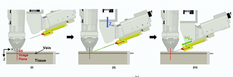 设备操作:(i)超声(US)成像平面提供目标血管的横截面图。(ii)一旦设备定位了血管,便通过Z轴运动(Zm)DoF马达对准针;Zm马达(蓝色箭头)负责使针头轨迹与血管深度(Z轴)对齐,以确保针尖准确地到达超声成像平面上的血管中心。(iii)轨迹对齐后,通过注射运动(Inj m)DoF马达(绿色箭头)插入针头,并在针尖到达血管中心后自动停止。