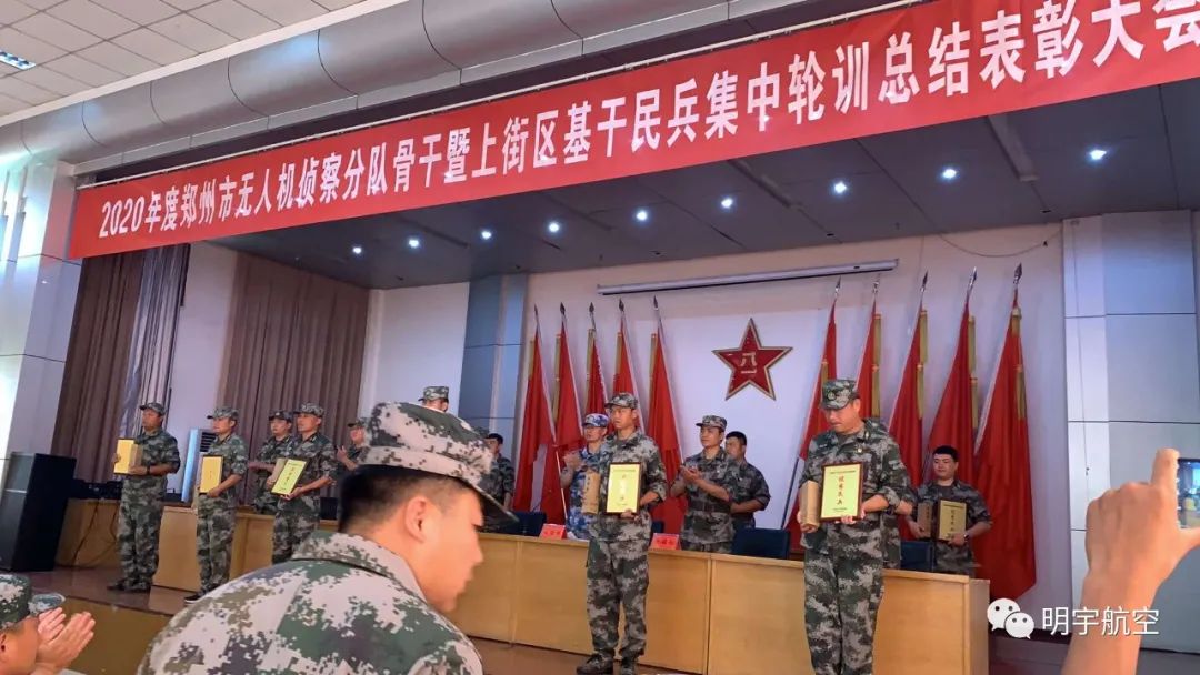 参训民兵身着统一的迷彩服,进行队列训练、手榴弹投掷、战术基础动作、无人机基础理论、巡航侦察拍摄、行业应用等科目的训练。烈日炎炎,训练中明宇公司的飞行教练们充分发扬了“不怕苦、不怕累”的精神,以饱满的热情、昂扬的斗志积极投入训练,用军人的标准严格要求自己。以专业的形象、过硬的技术得到了各区民兵们的一致好评,短短数十天让大家对无人机应用技术有了更深层次的理解及飞行技术方面的提高。在表彰大会上获得郑州市无人机侦察分队“军事训练先进班”、“优秀教练员”、“无人机训练标兵”等多项荣誉,更为保家卫国贡献了自己的一份力。