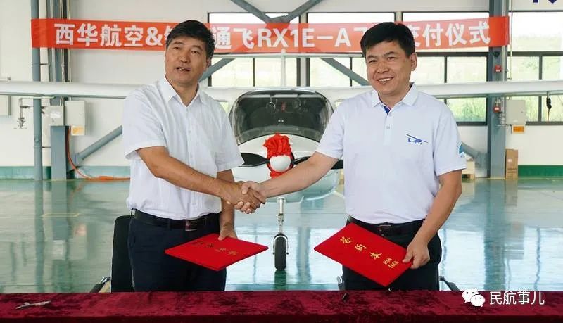 【民航事儿】8月26日上午,四川西华航空接收了一架由辽宁锐翔通用航空制造有限公司制造的RX1E-A型纯电动飞机,西华航空董事长李大军和辽宁锐翔董事长赵铁楠出席交接仪式,标志着在民航东北管理局、民航西南管理局、民航四川监管局和园区的大力支持下,由我国自主研发、生产的首架纯电动飞机在四川成都率先进入应用。这架纯电动飞机是由辽宁通航研究院研发,辽宁锐翔通航公司生产制造的。RX1E-A增程型纯电动飞机采用全碳纤维复合材料结构,以稀土永磁同步电动机为动力,以锂电池为能源的新型清洁能源飞机,最大起飞重量为600公斤,最大有效载荷160公斤,最大航程180公里,最大巡航时间90分钟,巡航高度1千米,巡航速度每小时110公里,主要用于执行飞行培训、飞行体验、低空巡视、空中游览等多种任务。飞机乘员两人,拥有14.5米的翼展,带来了20:1超高滑翔比,安装了整机救生伞,乘员安全得到绝对保障;在消耗不到30度电情况下保证两小时飞行时间。