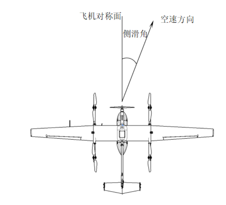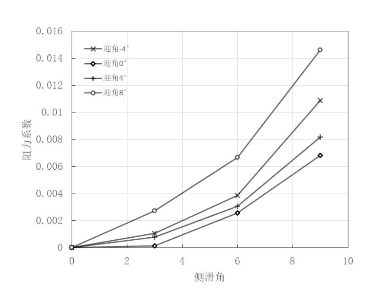 与无人机飞行速度方向平行(顺风和逆风)的稳定风不会对无人机的航时产生影响。与无人机飞行方向有一定夹角的风会降低无人机的续航性能。无人机保持航行不变的飞行中,遇到不平行于无人机飞行方向的风时,会使无人机的空速与无人机对称面之间形成一个夹角,该夹角称为侧滑角(如图11),带有侧滑角的飞行时,无人机的阻力会随侧滑角的增加而增加(如图12),导致无人机发动机的能耗增加,降低无人机的续航性能。