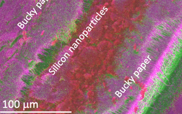 该研究的第一作者Shailendra Chiluwal说:“独立的碳纳米管片使硅纳米粒子彼此电连接。” “这些纳米管形成了准三维结构,即使经过500次循环,也将硅纳米粒子保持在一起,并减轻了由于纳米粒子破裂而产生的电阻。”