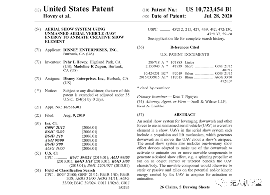 由迪斯尼(Disney Enterprises, Inc.)于2019年9月3日提交的专利——「使用无人机力量来制作创意表演元素的空中表演系统」(Aerial Show System Using Unmanned Aerial Vehicle Energy To AnimateCreative Show Element),在今年7月28日正式获得批出专利权。
