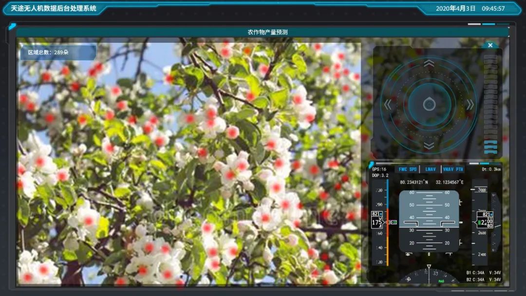使用天途研发的云控制平台无障碍接入中国移动农业大数据中心,支持多架天途G200植保无人机自主起飞、执行预定任务、数据回传等功能,通过5G链路实时回传到大数据中心,能够分析出每一棵树上苹果花的数量,10架无人机覆盖万亩苹果园采集任务只需6小时,采集完成后用户可通过手机实时得到作物收获期、产量及品质预估。同时还拥有播种适宜性分析、物候期预测、病虫害预测和农业气象灾害预测,从播种前的准备到收割入库,进行全面的指导。