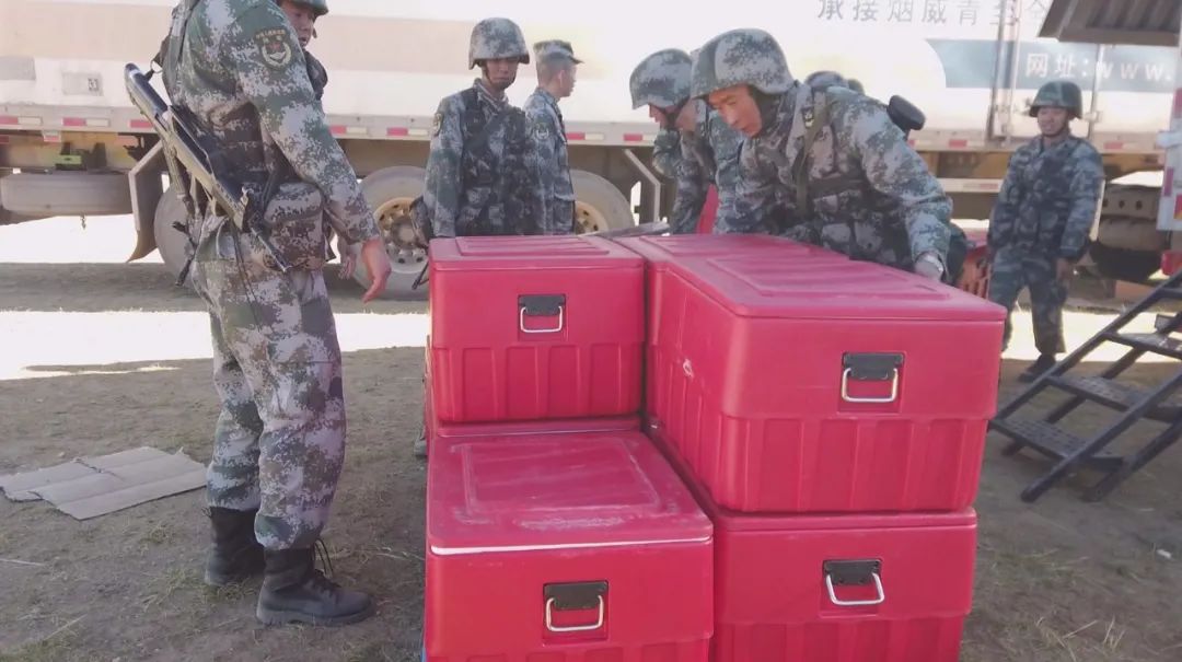 补给分队官兵从冷链车 中取出快餐