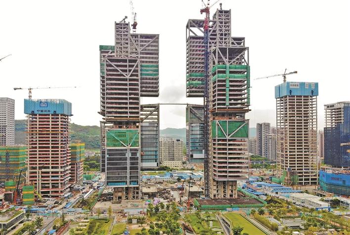 日前,位于南山区留仙洞的大疆天空之城项目封顶。大疆天空之城项目作为深圳市南山区重点建设项目,总建筑面积21.17万平方米,东塔211.6米、西塔193.1米是以巨型钢架为支撑、6个“悬挑方体”及钢连桥组成的高新技术产业巨擘。 深圳特区报记者 杨浩翰 摄