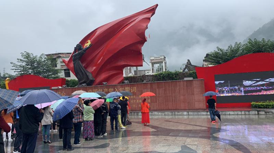 来自汶川县委宣传部长、县政府副县长、映秀镇镇长,以及应急局、文旅局等部门领导出席了由阿坝州无人机协会承办的汶川分会场会议。汶川分会场设于映秀镇宣誓广场。时逢下起小雨,汶川县领导和与会者在精神抖擞立于雨中,展示出汶川人民不屈不挠的精神面貌。