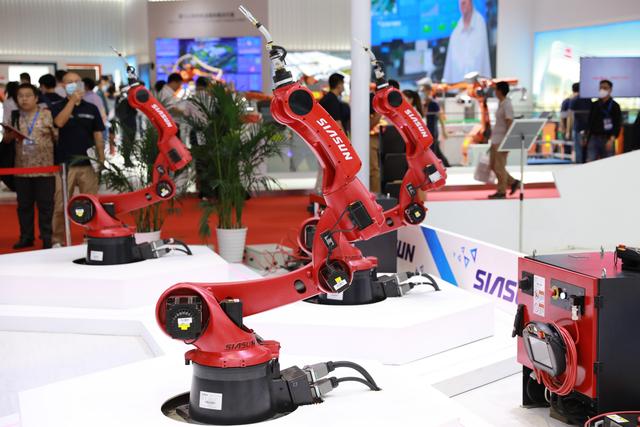 这是9月15日在第22届中国国际工业博览会上拍摄的天津新松机器人自动化有限公司的机器人智能焊接系统。
