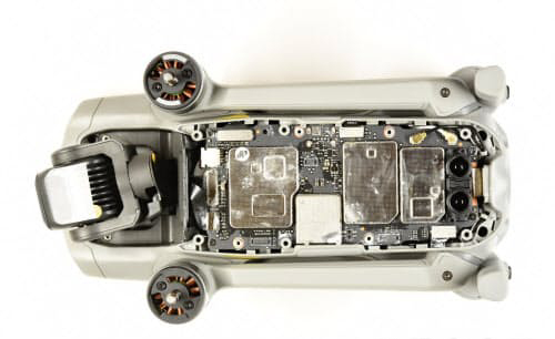 当然不仅限于低成本。作为调查对象的Mavic Air 2用于航拍时可拍摄4K画质,还具备自动跟踪和避开障碍物等功能。在日本,可从最远6公里处操控,无线传输影像的距离达到其他公司产品的约5倍。为了实现570克这一较轻的重量,采用了犹如电子设备的设计。主基板尺寸约为10厘米×4厘米,在1块基板上以高密度安装了控制和通信半导体、传感器等大小10个半导体零部件。