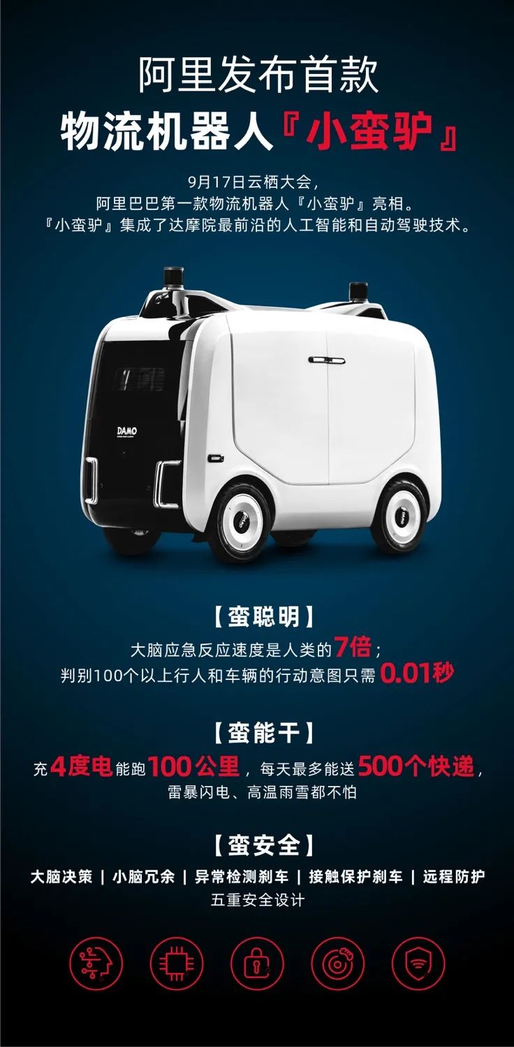 “在今年9月17日的云栖大会上,我爸爸阿里巴巴正式向大家介绍了我。作为阿里巴巴第一款轮式物流机器人,你可千万别看我长得酷萌酷萌的,事实上我的用处可多了。我的“大脑”反应速度是人脑的7倍,而且我身手灵活,充4度电就能跑100多公里,每天能送500个快递,碰到啥紧急情况我还能处理复杂路况,选择最优路径呢!”