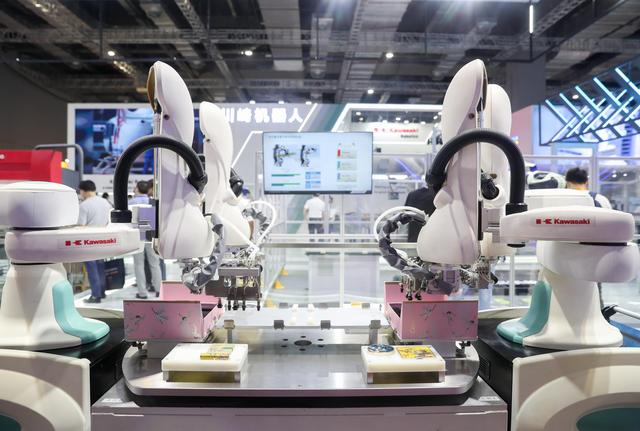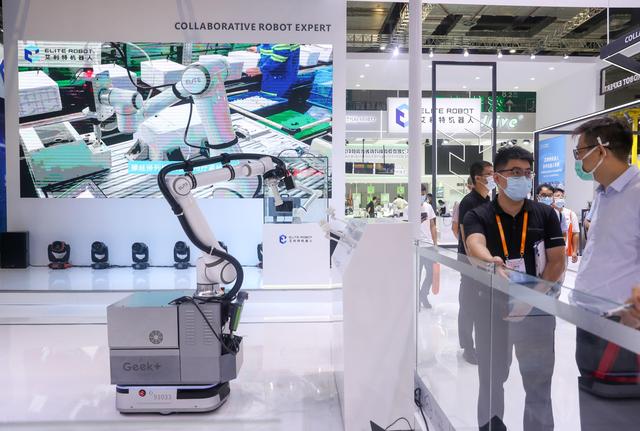 9月16日在展会现场拍摄的“双臂机器人”。在国家会展中心(上海)举行的第二十二届中国国际工业博览会上,机器人展区内的各类机器人在现场展示各自的“绝活”,吸引了众多参观者。