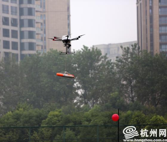演练现场,一架大型无人机动力充沛,运载能力强,挂载6公斤重物飞行,正向模拟落水者抛投救生圈。而在山林间有人受伤被困时,无人机也可向其投送急救包和食物饮用水等急需物资,可以搭建一条牢固的生命线。