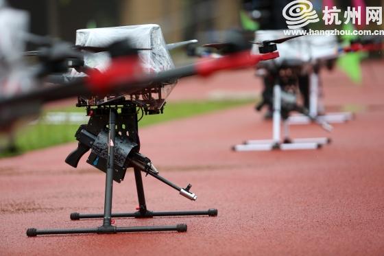 除了非杀伤性警械以外,无人机还可挂载武器进行直接打击。现场无人机挂载79式微冲开展对地打击,机上挂载了微型冲锋枪,通过加密频段遥控击发,配备机载瞄准镜,有效射程100米。无人机可突破地面维度,绕过一般障碍物,对掩体后的敌人进行打击,形成多维打击态势,有效压制、杀伤目标,保存有生力量。同时,无人机挂载的武器还配置了远程自毁系统,在无人机失控、被击落等情况发生时可以摧毁挂载的武器,防止被敌方利用。