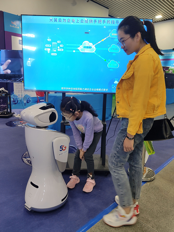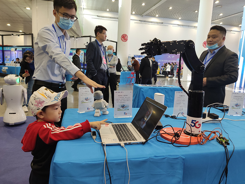 活动现场,观展市民在中国电信展厅与5G猜拳机器人比划猜拳,机器人可以快速捕捉观展市民的拳头动作,急速反应,在猜拳中处于不败之地;有的观展小朋友向“悟空”机器人发号俯卧撑、跳舞等指令后,机器人统统能遵照执行,留给小朋友一脸的好奇和兴奋;也有观展市民戴上VR设备,感受千里之外的360°全景高清视频体验。
