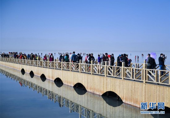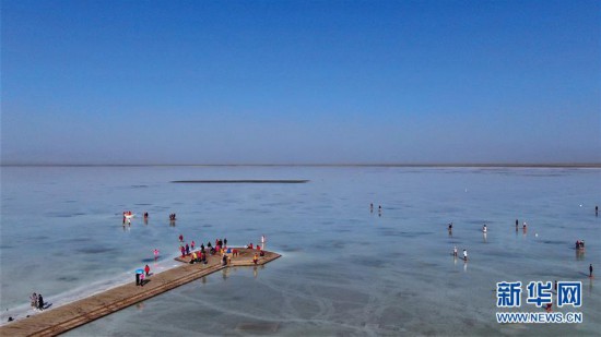 9月23日,游客在茶卡盐湖“天空之镜”景区游玩。新华社记者 张龙 摄